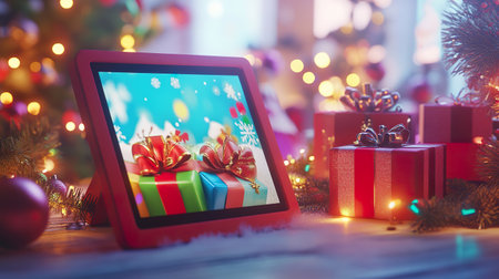 Festive digital tablet displaying holiday gifts surrounded by Christmas decorations, creating joyful atmosphere.