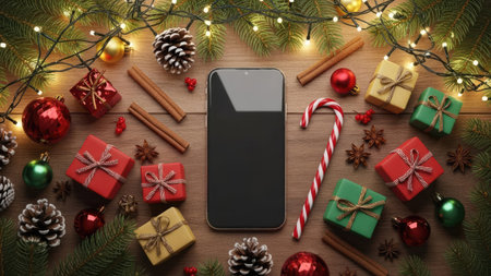 A top-down view showcases a smartphone with a blank screen, central to holiday-themed decorations. Presents, ornaments, and cinnamon sticks are artfully arranged on a wooden surface. Warm lighting enhances the festive scene, suitable for advertising, and seasonal content. The composition presents a visually appealing, inviting scene.