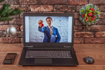 Christmas, new year's composition. Branches of the Christmas tree are decorated with Christmas balls on the background of a laptop