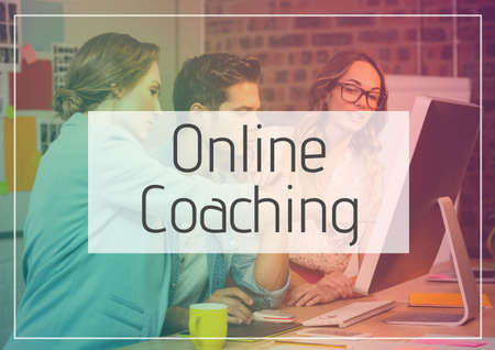 Online coaching text banner against office colleagues using computer at office. online course and coaching background template illustration concept