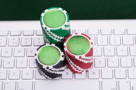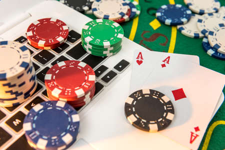 Image of casino chips and cards on a keyboard notebook at green table. Concept for online gambling, poker, virtual casino.