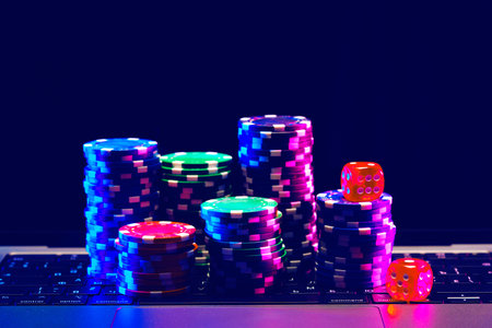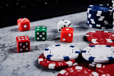 Online casino theme. Gambling chips and five red dices on laptop keyboard