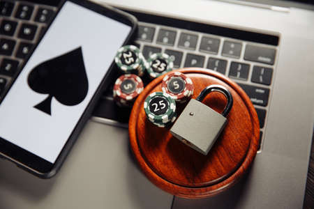 Law and rules for online gambling concept, smartphone and padlock with playing cards and chips on laptop