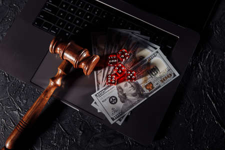 Law and rules for online gambling, judge gavel and dice on keyboard