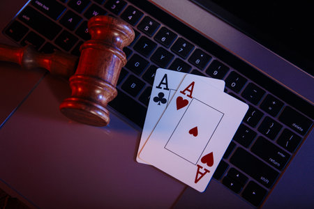 Law and rules for online casino concept, judge gavel and aces on keyboard of laptop