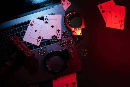 Chips, cards and handcuffs on the laptop, top view. Online gamblig and law concept