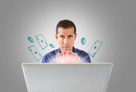 Young man play online poker in laptop. Unrecognizable person in neon light.