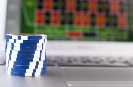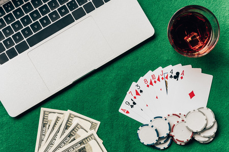 Stack of chips, money and cards are on laptop. Online casino and gambling concept