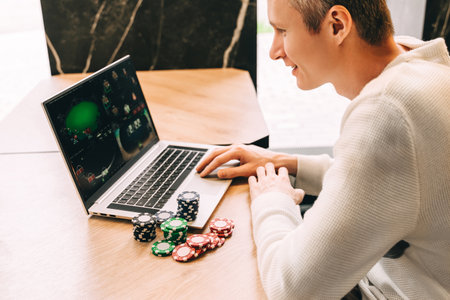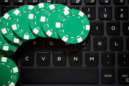 Online casino laptop. Laptop keyboard and chips with dice and money cash dollars on green gaming table. Game addiction gambling. Poker online. Copy space for text