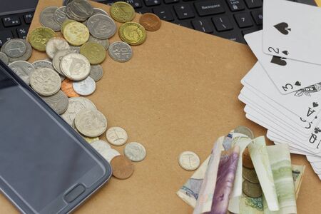 Playing cards, laptop, smart phone and money. Copy space and background. Concept of online gambling,addiction.