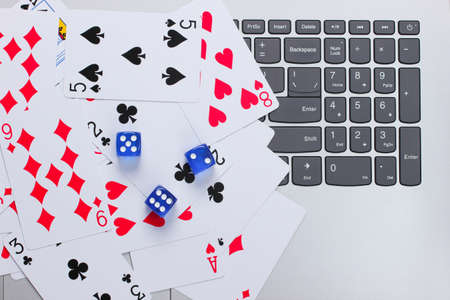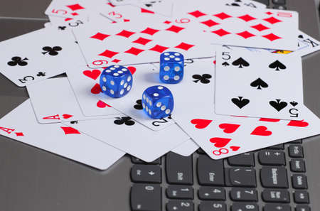 Playing Cards and Blue Dice on a laptop keyboard. Online poker casino