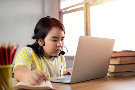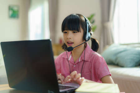 Asian girl student online learning class study online video call zoom teacher, Happy girl learn english language online with laptop at home.New normal.Covid-19 coronavirus.Social distancing.stay home