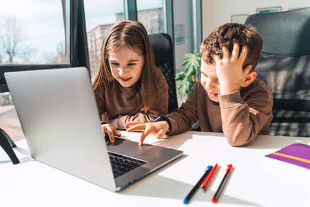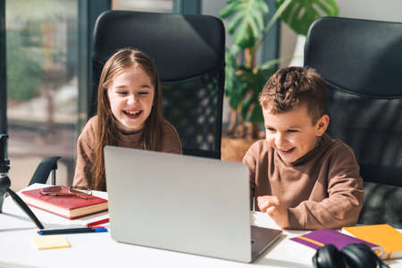 Smiling boy and girl study online in home at the laptop