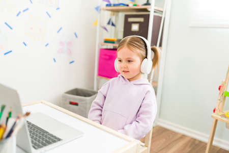 Caucasian girl student with headphones sitting at her small desk at home and paying attention during her virtual class for elementary school