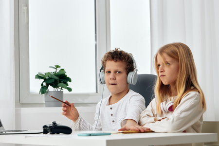 Boy and girl studies at home and doing school homework. Distance learning online education.