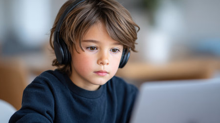 Boy wearing headphones is intently using a laptop in a warm indoor setting, showcasing concentration and engagement in digital activities