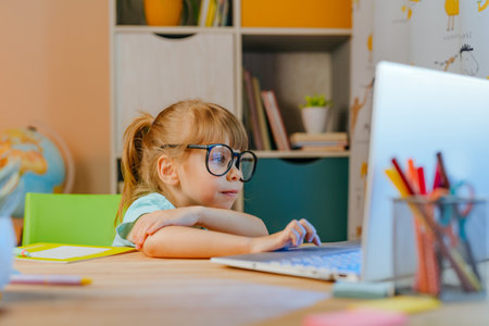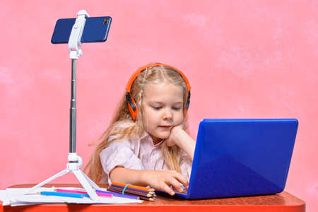 7 year old girl studying online. Webinar. Education at home.