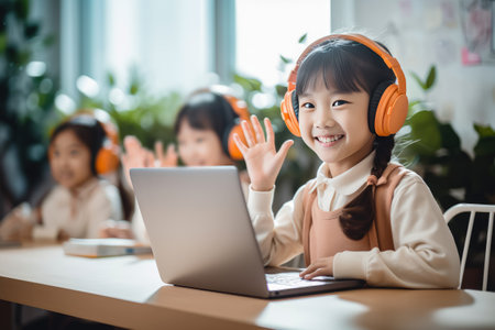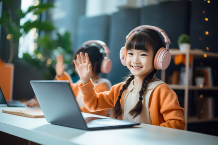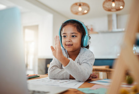 Video call, laptop and child for e learning, online class and home education, translation and listening on headphones. Happy kid or girl waves hello on computer, teaching platform and virtual school