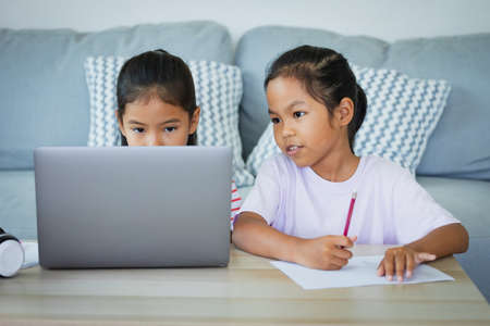 Two asian child girl students study online with teacher by video call together. Siblings are homeschooling with computer laptop during quarantine due to pandemic.