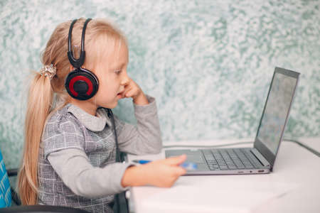 Beautiful little 5 years old girl using laptop sitting at the table in the room. Online education concept. Communication online, video chat. Family using technology at home. selective focus.