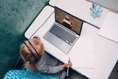 Education online teacher student.Child girl does online lesson video call teacher using computer sitting at desk at home. Distance learning teaching course for schoolchildren.