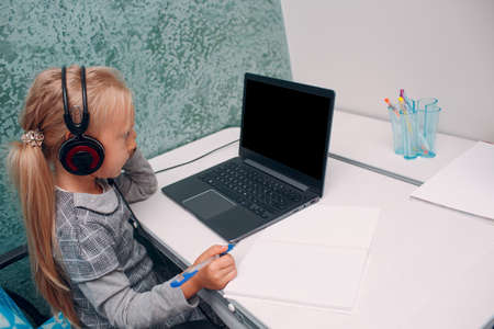 Cute little girl with headphones using laptop to study at home, writing, answer, online learning, education, social distance, quarantine.