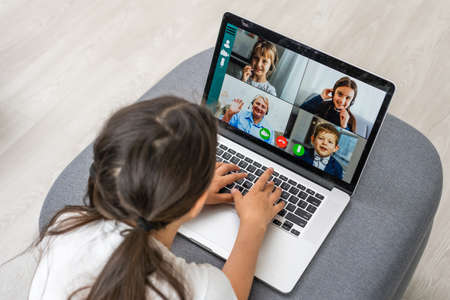 Home schooling. A girl is sitting at a table with a laptop during an online video chat of a school lesson with a teacher and class. Concept of distance education. Self-isolation in quarantine.