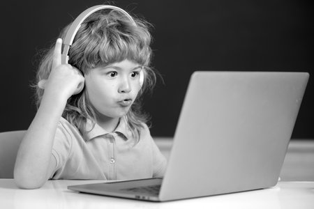 Idea. Genius child boy in headphones using a laptop and study online with video call teacher at school.