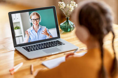 Back view of teacher talking with student in video conference. Teacher and student using laptop for online learning in video call. Schoolchildren studying from home.