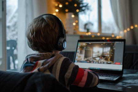 Child in headphones looking at laptop screen during the day