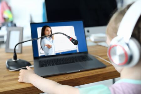 Little kid communicates online with teacher. Home schooling concept.