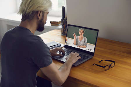 Remote education concept. Young guy talking to his college teacher from home. Student having online conference with tutor on laptop