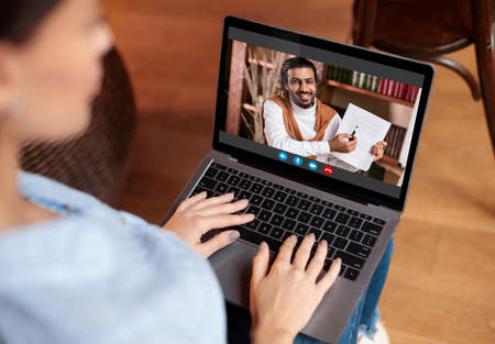 Over the shoulder view of woman sitting and using modern laptop, typing on keyboard while having video conference with her teacher showing paper with text, studying online at home
