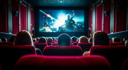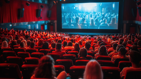 Crowd of people sitting and watching a film in a cinema with red seats and dramatic lighting
