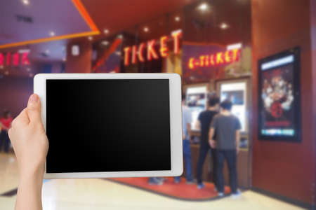 human hand hold and touch smartphone, tablet, cell phone with blank screen on blurry theater, Online booking ticket concept.