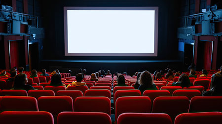 Blank cinema wide screen and people in the red cinema hall. AI generative