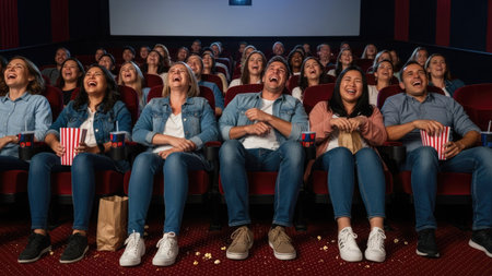 A group of diverse people sit in a movie theater laughing. The composition includes multiple rows of seated individuals. The scene utilizes a wide shot with soft lighting. This image could be used for advertising, editorial, or promotional material for entertainment or social events.