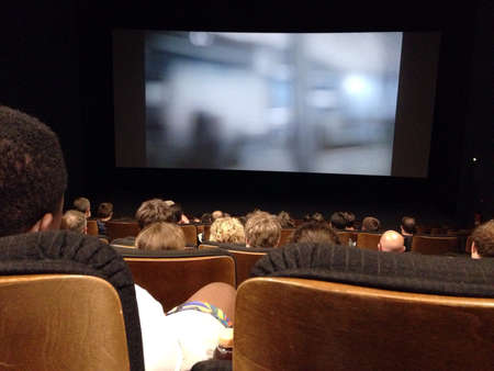 People in cinema hall. Viewers sitting in two rows watching on blank screen