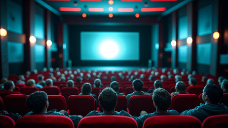 Empty movie theater with rows of dark, plush seats and a subtle glow from dim lighting screen ready for a film