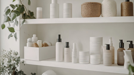 Skincare and beauty products in elegant bottles arranged on a shelf in a modern bathroom