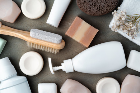 Composition with bath accessories and cosmetics on light background