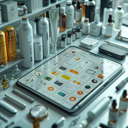A curated display of household items, beauty products, and small electronics, all in soft, muted tones, arranged neatly against a serene blue backdrop.
