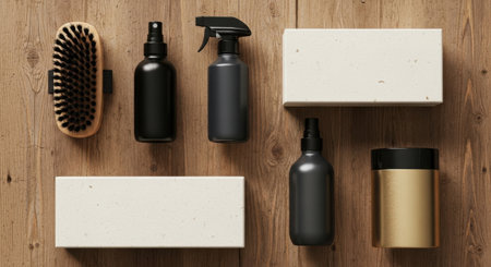A collection of dark bottles, brushes, and boxes are artfully displayed on a warm wood backdrop.