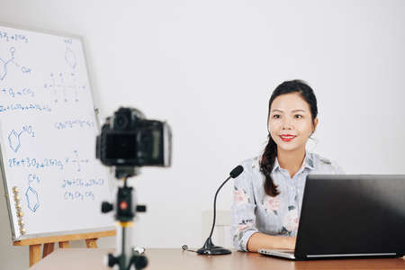 Smiling young Asian chemistry teacher filming webinar or conducting online class for student