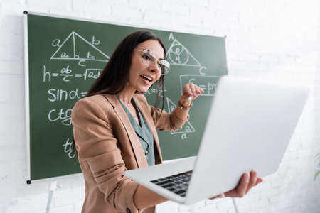 Teacher talking and holding laptop during online lecture near chalkboard in classroom