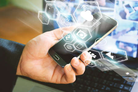 businessman hand use the smartphone device online to network social internet of things concept, data deep learning ai ui, hacker on server system, digital trade risk working