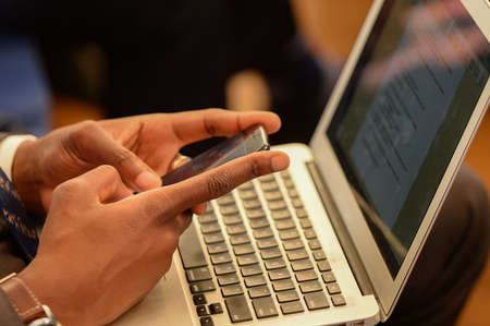 Trader man using smart phone and typing on laptop. Finance and trade concept. Close up
