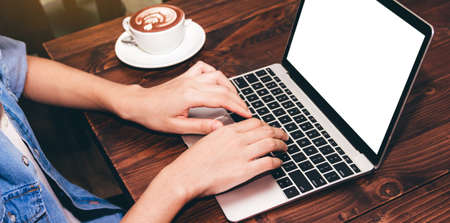 Mans hands using laptop with blank screen on desk in home interior. Mockup image white screen.