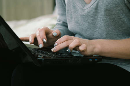 Woman hands with manicure typing on laptop computer keyboard - close up side view. Communication, workplace, business, education, freelance, internet, leisure time and technology concept