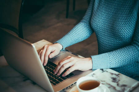 Female hands typing on the laptop keyboard in cafe. Toned picture